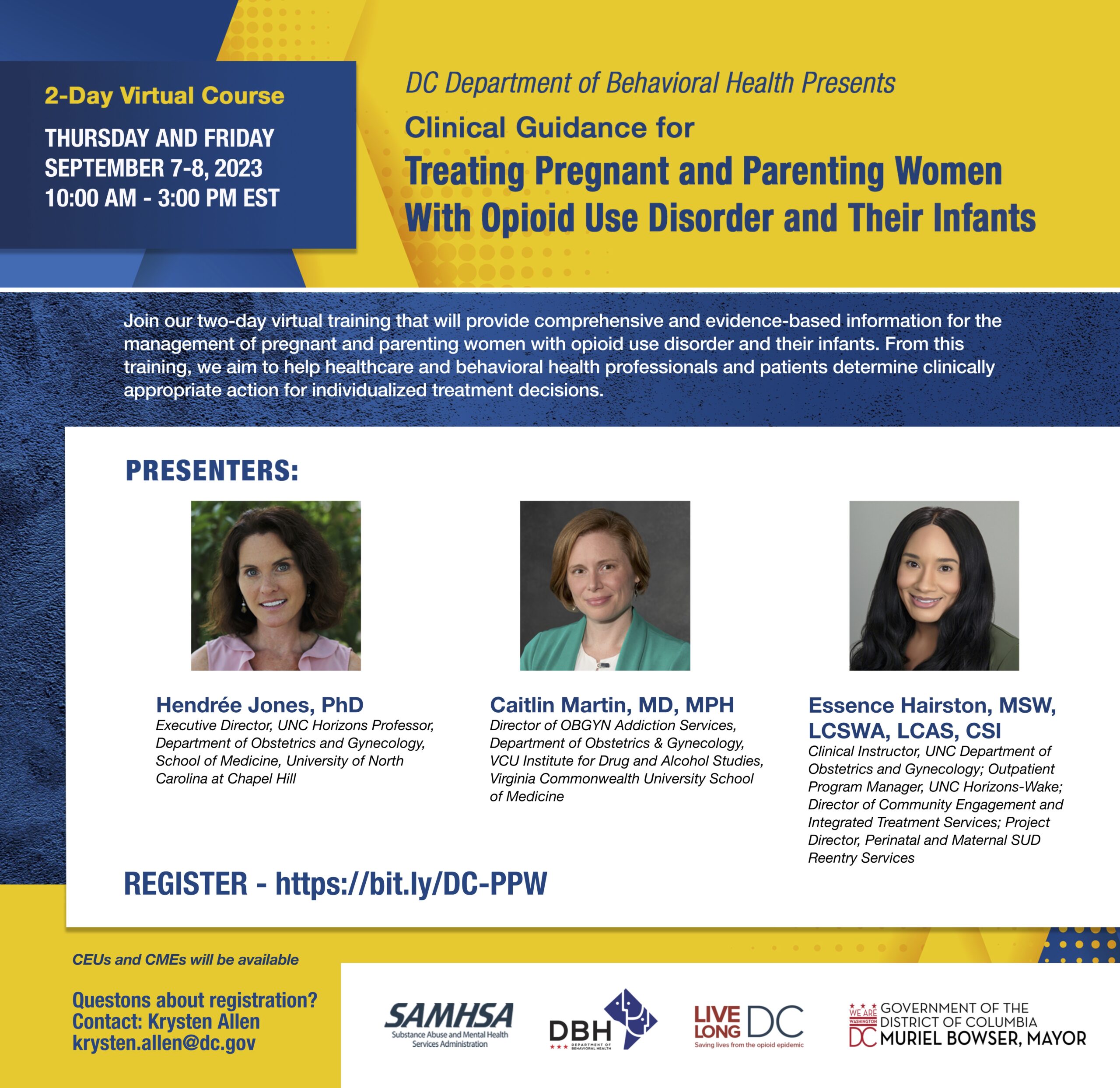 Description:Sponsored by the DC Department of Behavioral Health in collaboration with the Substance Abuse and Mental Health Services Administration (SAMHSA), this two-day (2) virtual training event is designed to help physicians and other healthcare and behavioral professionals who care for or support pregnant and parenting women with opioid use disorder make clinically appropriate and individualized treatment decisions that will promote the best possible outcomes for both mothers and their infants. The information covered in this course is based on SAMHSA’s Clinical Guidance for Treating Pregnant and Parenting Women with Opioid Use Disorder and Their Infants.