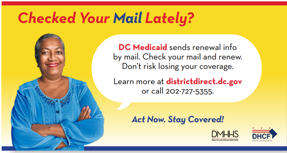 You can help inform Medicaid beneficiaries about renewing their Medicaid coverage and exploring other available health insurance options (if they no longer qualify for Medicaid, Alliance, or the Immigrant Children’s Program). Find training videos, meeting recordings, and a wealth of information on the renewal process on the DC Medicaid Renewal webpage. DHCF’s Stakeholder Communications Toolkit also has instructions for using the District’s online benefits portal, District Direct. You can help individuals create an account, update their information, and access call centers where interpreters and in-language staff are on hand to assist. All Medicaid beneficiaries should renew their health coverage by or before June 30, 2024.