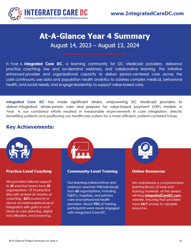 We invite you to review the At-A-Glance report and explore the tools and training materials from our learning series on our website at IntegratedCareDC.com.