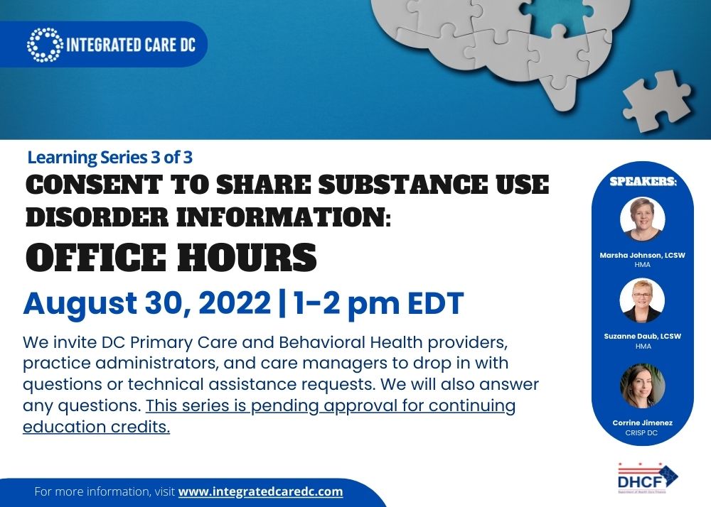 Speakers: Jodi Pekkala, MPH, Marsha Johnson, LCSW, Suzanne Daub, LCSW, and Corrine Jimenez, MS, CRISP DC Project Manager