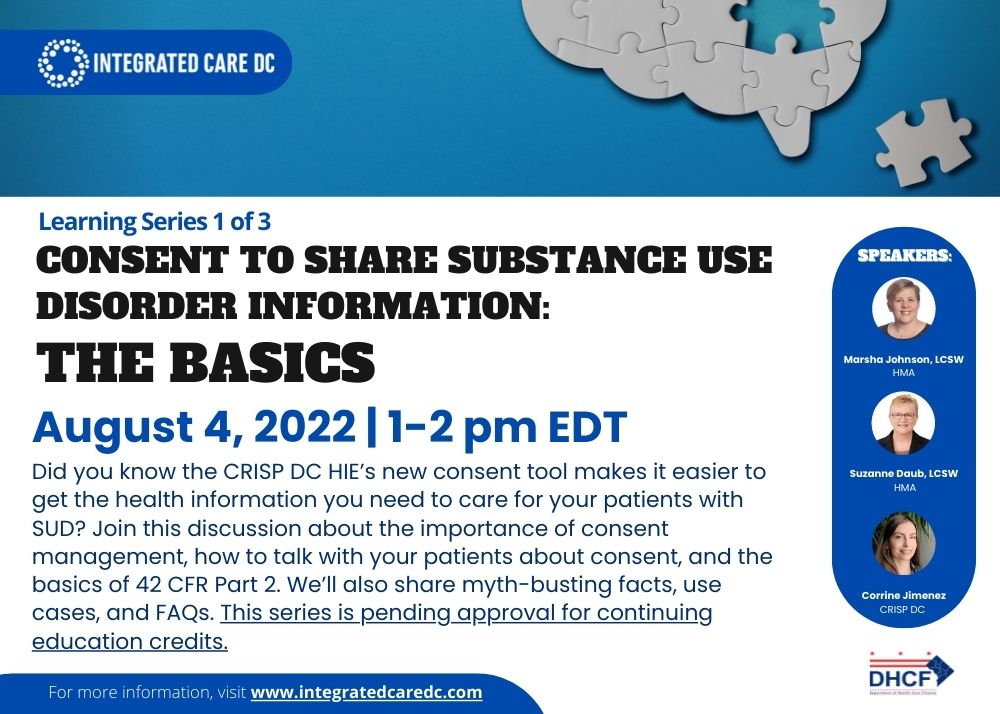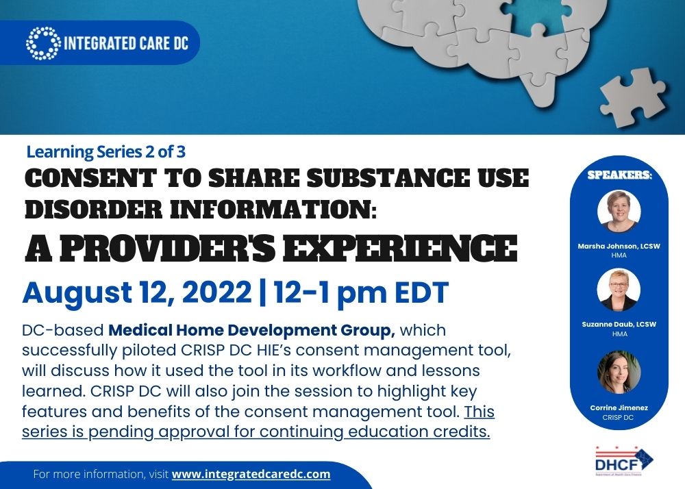 CRISP DC is partnering with DHCF to develop a comprehensive, open-source consent management solution to enable compliant electronic exchange of behavioral health information, including substance use disorder (SUD) data protected by 42 CFR Part II, through the District of Columbia Health Information Exchange (DC HIE). Based on a patient’s authorization, this data is shared with treating providers through the DC HIE. CRISP DC piloted the configurable electronic consent management tool to initial user groups over the last year and is prepared to make this tool available to all clinical CRISP users now. Click here to download the PDF one-pager.