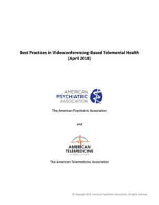 This document represents a collaboration between the American Psychiatric Association (APA) and the American Telemedicine Association (ATA) to create a consolidated update of the previous APA and ATA official documents and resources in telemental health to provide a single guide on best practices in clinical videoconferencing in mental health. The APA is the main professional organization of psychiatrists and trainee psychiatrists in the United States, and the largest psychiatric organization in the world. The ATA, with members from throughout the United States and the world, is the principal organization bringing together telemedicine practitioners, healthcare institutions, government agencies, vendors, and others involved in providing remote healthcare using telecommunications. These guidelines focus on interactive videoconferencing-based mental health services (a.k.a., telemental health). The use of other technologies such as virtual reality, electronic mail, electronic health records, telephony, remote monitoring devices, chat rooms, or social networks. are not a focus of this document except where these technologies interface with videoconferencing services.