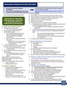 This one-page handout is designed for busy outpatient providers who wish to start a patient on buprenorphine but need guidance on what to do before, important things not to forget when starting, how to monitor patients on buprenorphine, what to do if the patient is or is not doing well and duration of treatment.