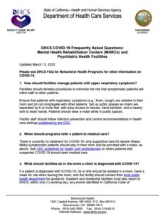 The frequently asked question document makes recommendations on how to care for patients during the COVID-19 pandemic in Mental Health Rehabilitation Centers and Psychiatric Health facilities. The recommendations suggest how to provide Telehealth services, and how to provide medical care for positive COVID-19 patients.