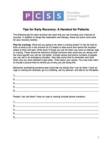 Patients can use this Early Recovery Handout to determine behaviors when cravings or urges arise or behaviors have changed. The document provides strategy to mitigate any behavioral outliers while keeping the patient on track from day to day.