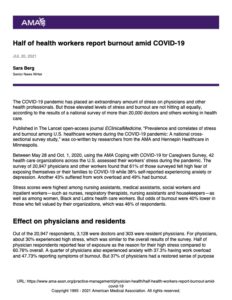 Published in The Lancet open-access journal EClinicalMedicine, “Prevalence and correlates of stress and burnout among U.S. healthcare workers during the COVID-19 pandemic: A national cross-sectional survey study,” was co-written by researchers from the AMA and Hennepin Healthcare in Minneapolis.