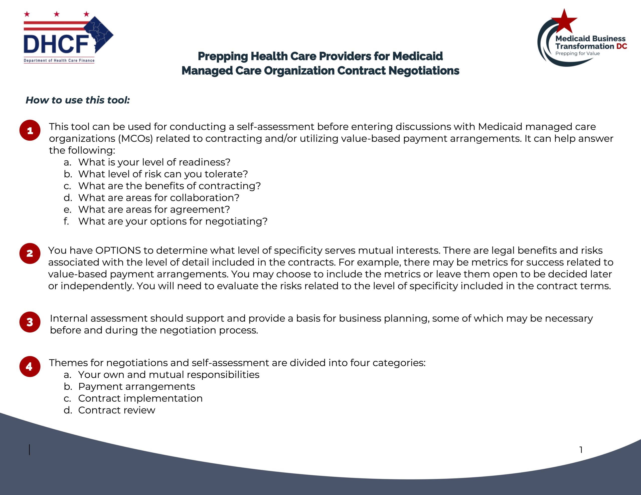 Description: This is a self-assessment tool intended to help healthcare providers plan for negotiations around proposed managed care contracts. The tool can be used for internal conversations to analyze key terms, develop strategic direction, and set priorities for approaching negotiations. This tool can help providers determine if they are ready to contract, what level of risk they can tolerate, and what areas to focus on in negotiations.