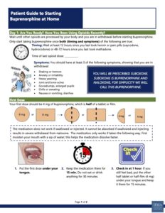This one-page handout will help patients understand when they will start buprenorphine, based on the last time they used opioids and their current level of symptoms. It describes how to take buprenorphine in order for it to help with cravings and withdrawal symptoms, what dose of medication to take when starting and afterwards, and other important information about buprenorphine.