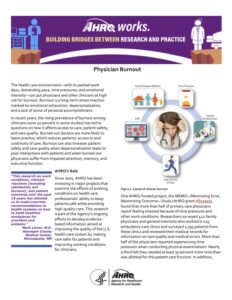 The health care environment—with its packed workdays, demanding pace, time pressures, and emotional intensity—can put physicians and other clinicians at high risk for burnout. Burnout is a long-term stress reaction marked by emotional exhaustion, depersonalization, and a lack of sense of personal accomplishment. In recent years, the rising prevalence of burnout among clinicians (over 50 percent in some studies) has led to questions on how it affects access to care, patient safety, and care quality. Burned-out doctors are more likely to leave practice, which reduces patients’ access to and continuity of care. Burnout can also threaten patient safety and care quality when depersonalization leads to poor interactions with patients and when burned-out physicians suffer from impaired attention, memory, and executive function.