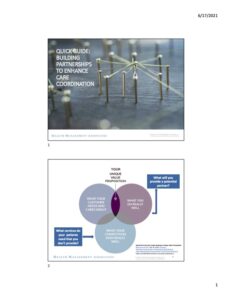This is a short reference guide to developing a structure to enhance the referral experience for providers and service recipients. It covers setting standards for partnership starting with your value proposition. It outlines the continuum of provider relationships from informal agreements through forming a business entity and finally provides initial guidance and further resources for establishing care compacts.