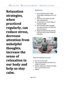 This patient-facing handout reviews basic steps for meditation, deep breathing, progressive muscle relaxation, and imagery. This can be used when explaining stress reduction techniques to patients.
