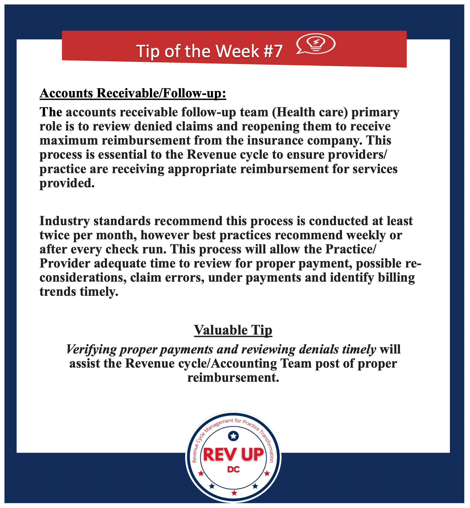 Valuable Revenue Cycle Tip of the Week #7 is one of the FREE resources provided by Rev-Up DC, sponsored by the Department of Health Care Finance (DHCF). to help DC Medicaid Behavioral Health providers transition to participating in the Managed Care contracts.