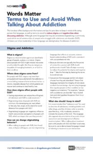 This handout offers background information and tips for providers to keep in mind while using person-first language, as well as terms to avoid to reduce stigma and negative bias when discussing addiction. Although some language that may be considered stigmatizing is commonly used within social communities of people who struggle with substance use disorder (SUD), clinicians can show leadership in how language can destigmatize the disease of addiction.